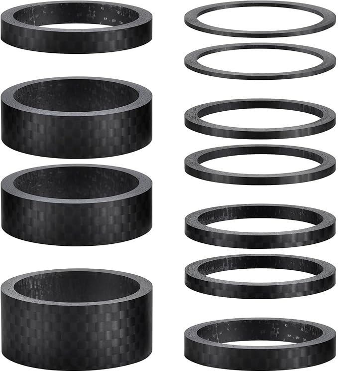 - Dimensions and Quantity: This package includes 11Pcs carbon fiber headset spacers, 6 different sizes: 2×1mm, 2×2mm, 2×3mm, 2×5mm, 2×10mm, and 1×15mm. Suitable for different riding heights to accommodate diverse riding experiences.