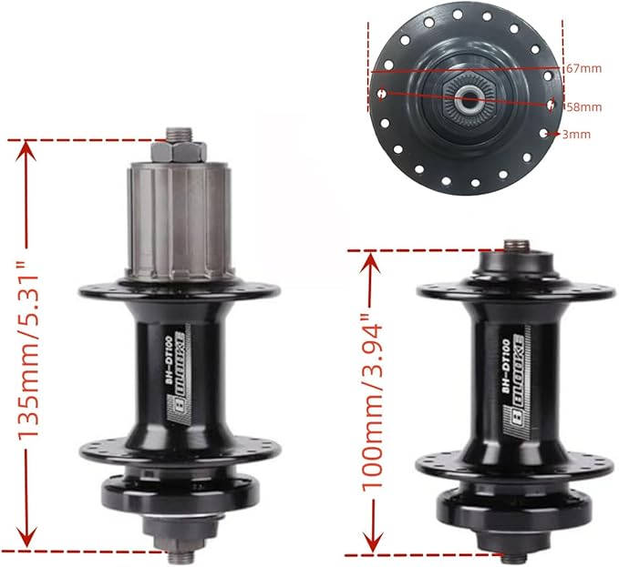 - Material: aluminum alloy hub. Hub size: front hub 9x100mm,rear hub 10x135mm, 36 holes, quick release hub.