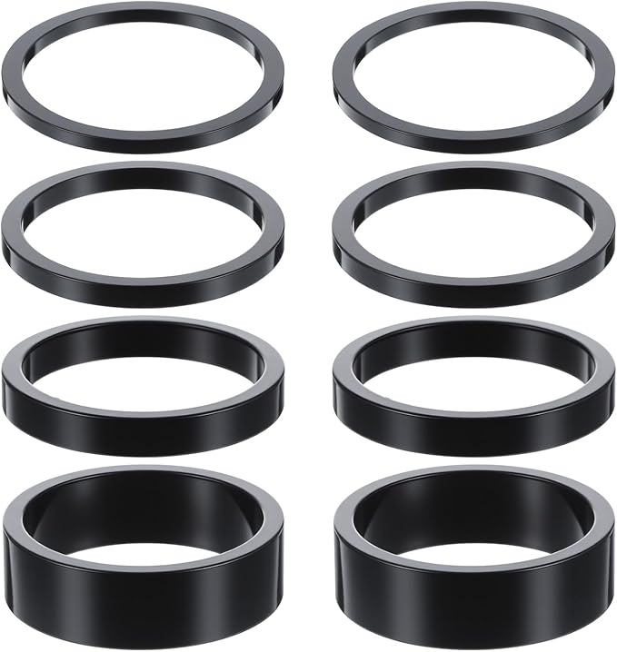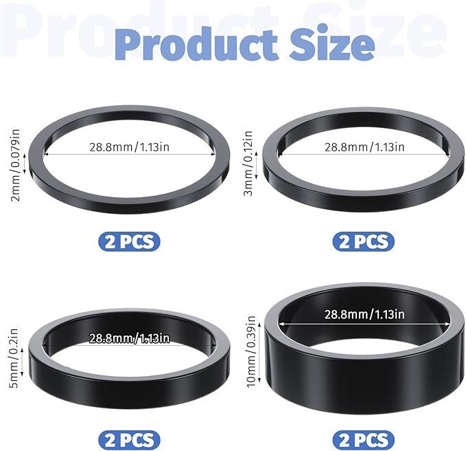 - Package Contents: You will receive 8 pieces of bike headset spacers in 4 size: 2mm, 3mm, 5mm, 10mm, 2pcs each size. These bike stem spacers allow for customizable handlebar height adjustments to accommodate diverse riding experiences.