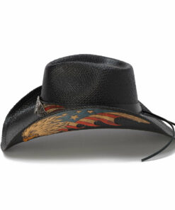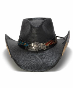 Black Eagle Straw Cowboy Hat, It has a 3 1/2″ brim and a 4 1/4″ pinch front teardrop crown. It features a quality Panama Straw and USA logo with wings and stars buckle. This one-of-a-kind piece makes a bold statement of patriotism.Lightweight and durable, it’s unlined for breathability.