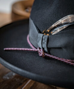 Modern Felt Hat, This is a medium height centre dent with a 7 cm / 2.75 in overwelt pencil roll brim. It features a 38 mm modern grosgrain hatband with a double back bow & leather cord.