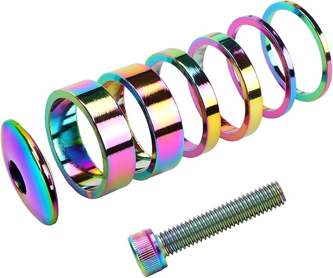 - Rainbow Headset cover kit include: 10mm spacersx2pcs,5mm spacersx2pcs, 2mm spacersx2pcs,M5x35mm bolt x1pc,Stem cap x1pc