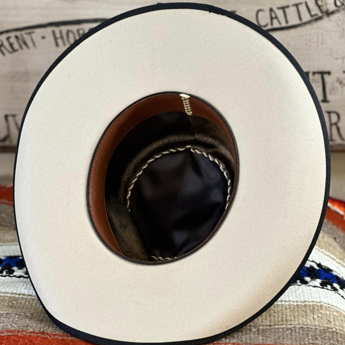 This light belly and it’s tan tones fit the bill with the black trim. The pinched front crown is 4.5″ in the back with a slight slope to 4″ in the front. The 4″ brim has a soft roll on the sides with a black bound edge. The 7/8″ grosgrain ribbon has an old fashioned look with a Cross concho to anchor it. Overall this hat is very unique with it’s look, band and style.