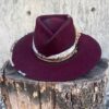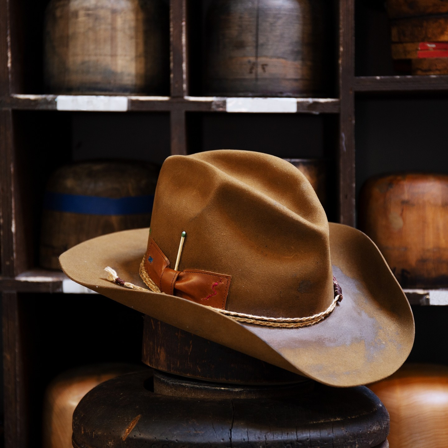 It has a low profile Gus creased crown that is 4.75″ in the back and slopes to 4.25″ in the front. The 3.75″ brim has a small pencil curl on the sides and a nice slope in the front and back. It is topped off with an antique looking leather hat band. We really like this one with its unique look and versatility.